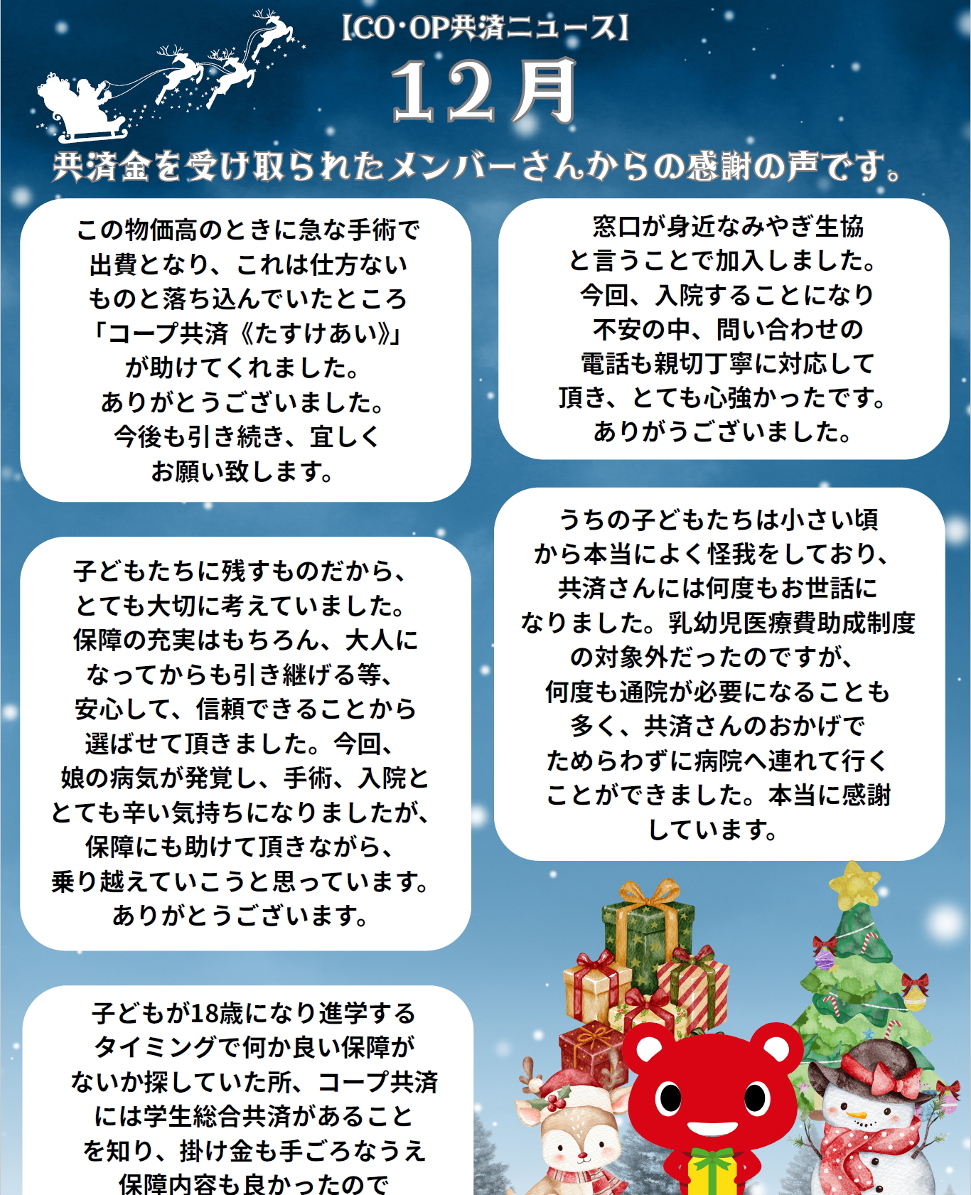 12月の「ありがとうの声」 2025/12/012026/03/24ありがとうの声みやぎ・ふくしま ※ご加入には、告知事項に回答していただく必要があります。※お支払内容や、共済金請求書類につきましては、ご契約内容・ご請求内容によって異なります。※実際のお支払いは共済金請求書ご提出後の判断となります。※詳しくは、加入申込書付宣伝物をご覧ください。 「たすけあい」の心でつなぐCO・OP共済。加入の輪が広がるごとに、少しずつお役立ちの幅を広げてきました。 詳しくは「コープ共済」のHPをご覧ください。 ※お寄せいただいた内容で資料を郵送させていただきます。